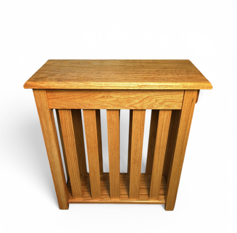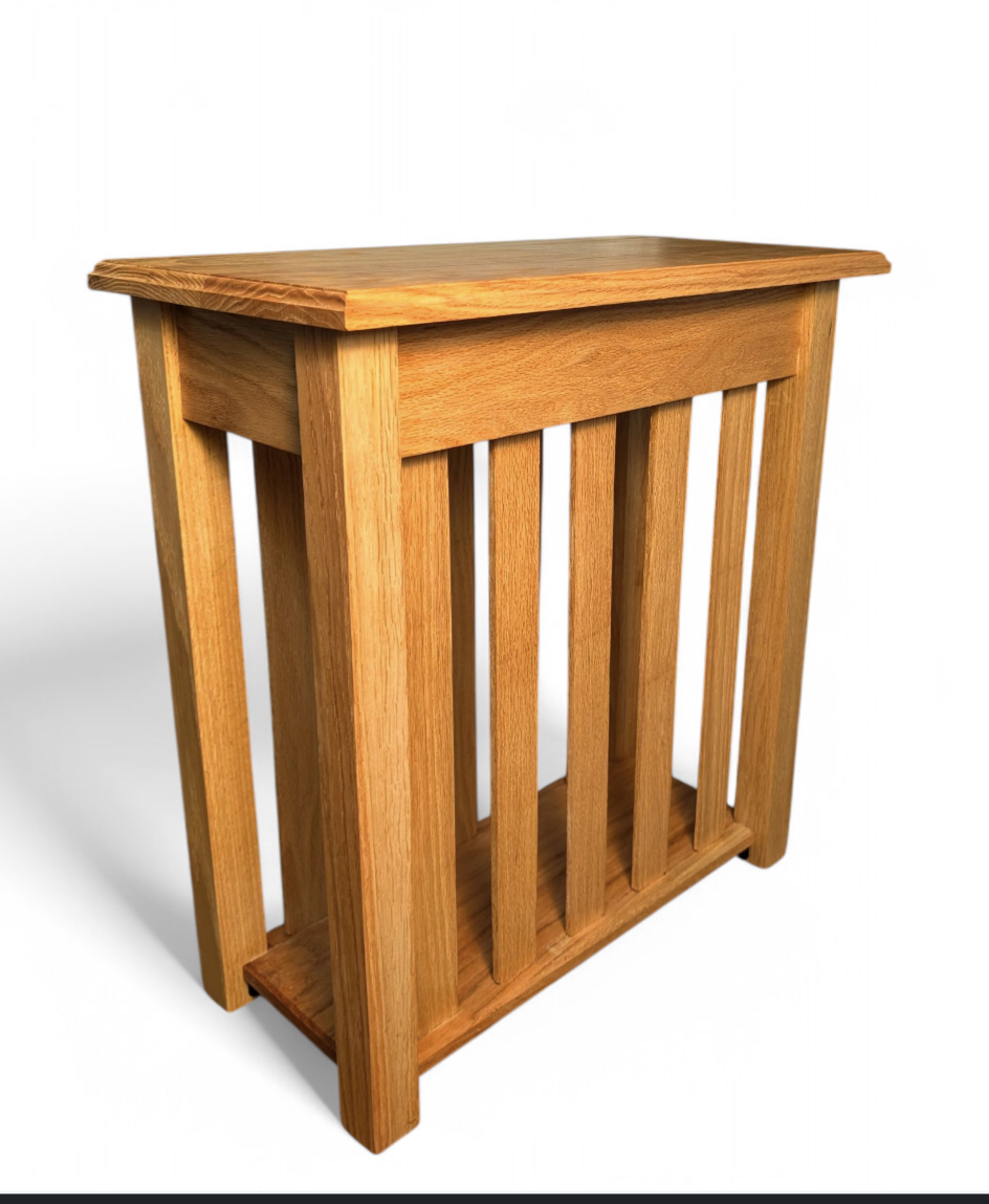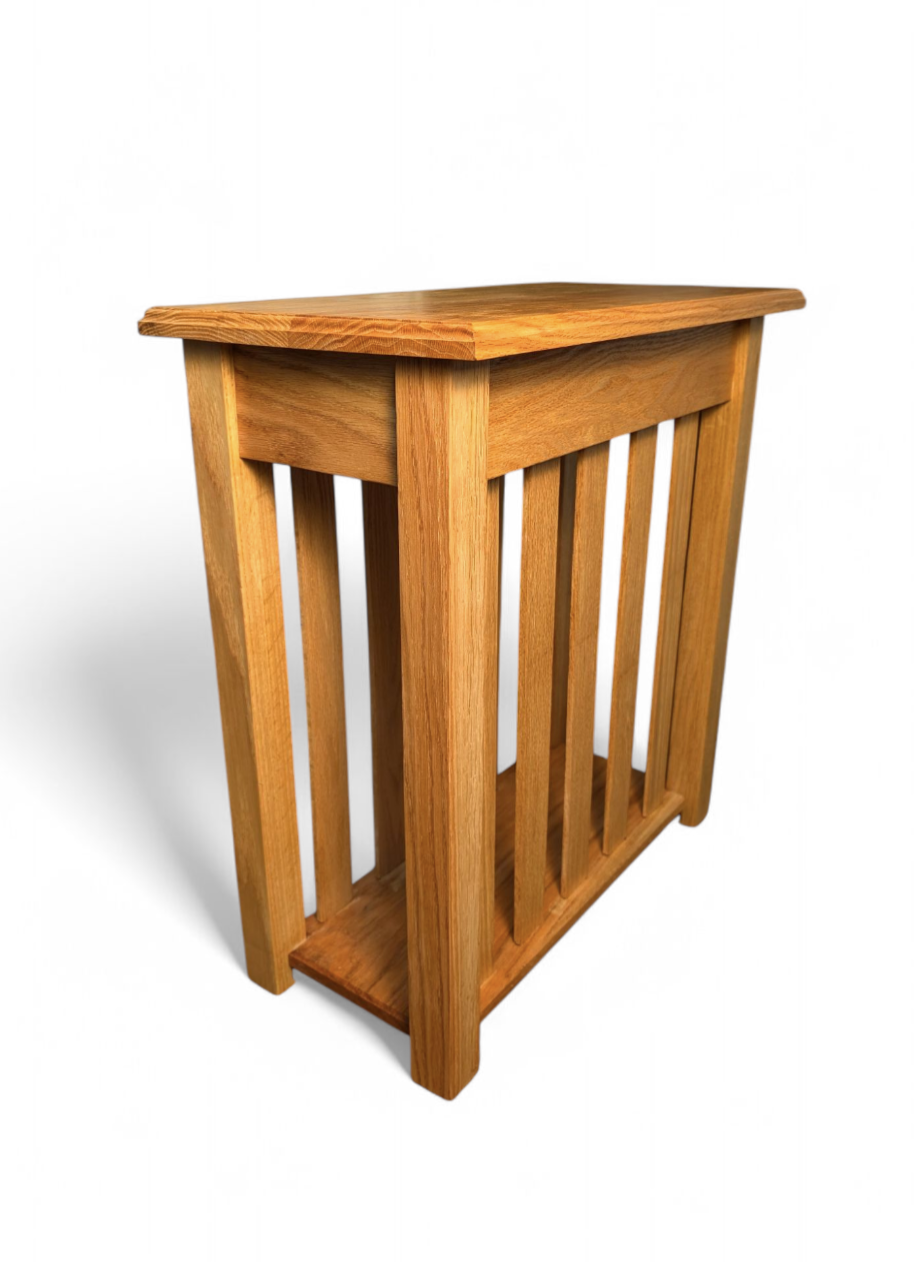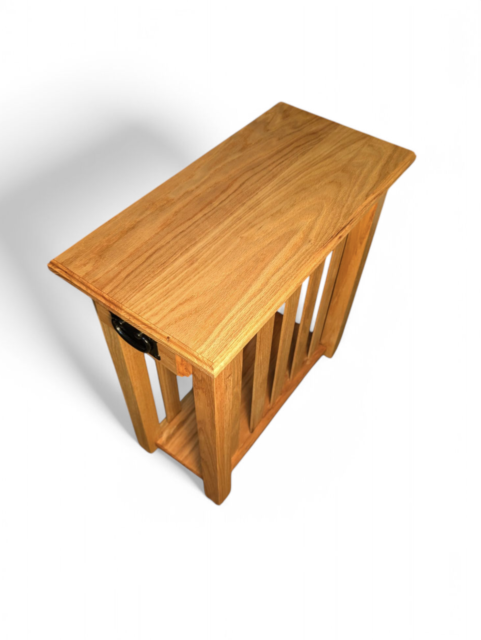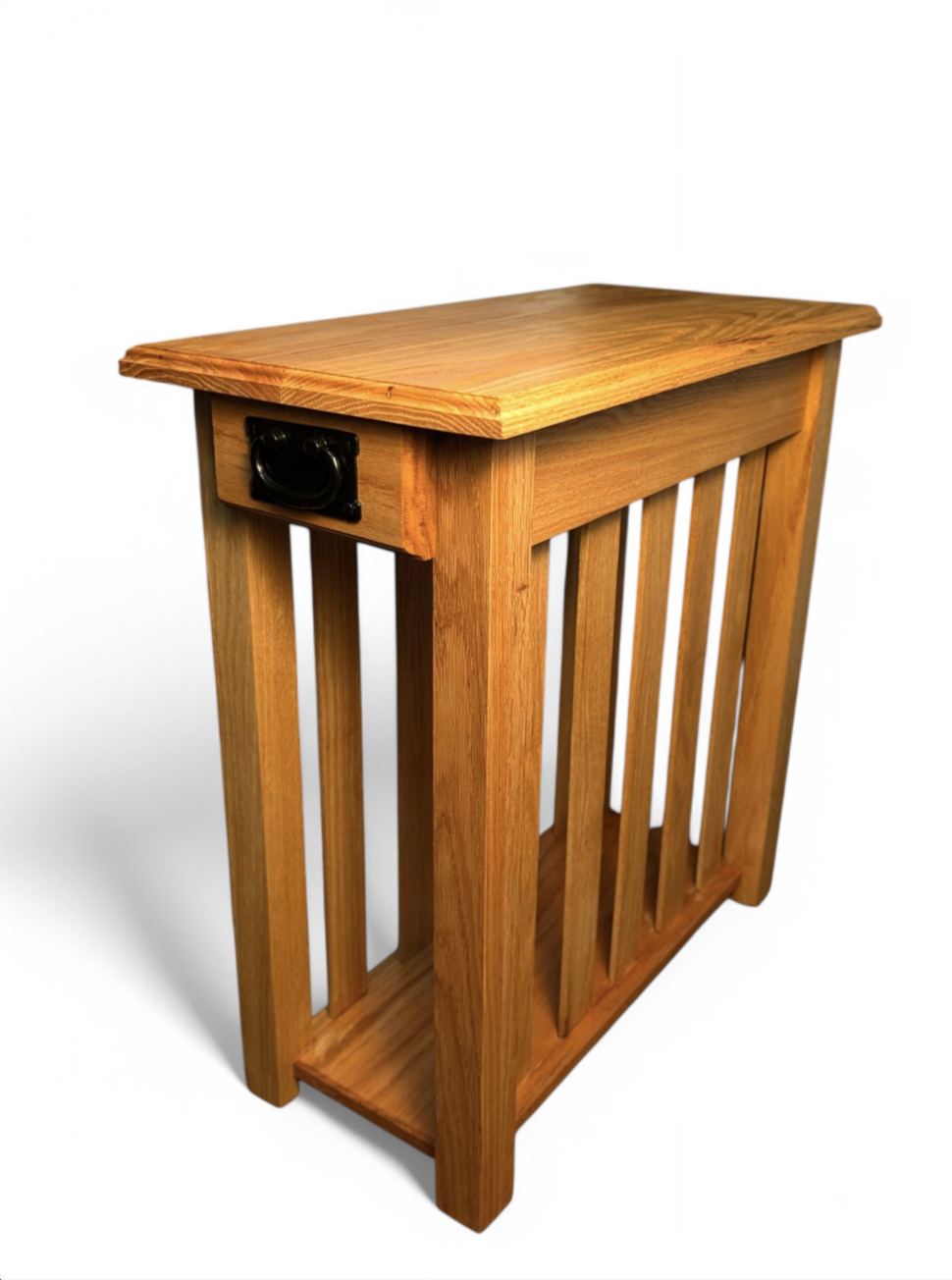 This Mission-style oak end table isn’t just furniture—it’s craftsmanship you can feel. Made from solid oak with classic slatted sides, a smooth-gliding drawer, and a sturdy lower shelf, it’s perfect for holding your coffee, remotes, or favorite reads. The black metal pull adds just the right touch of rustic charm.