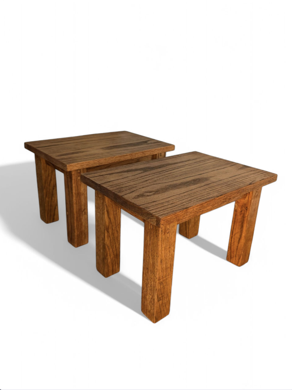 These small oak end tables are a perfect blend of charm and functionality. Crafted from solid oak, they showcase the wood’s rich grain and warm tones, adding a touch of natural beauty to any space. Their compact size makes them ideal for placement beside a sofa, chair, or bed, providing a sturdy surface for lamps, books, or décor. Built with clean lines and a durable finish, these tables offer both timeless style and everyday practicality, making them a versatile addition to any home.