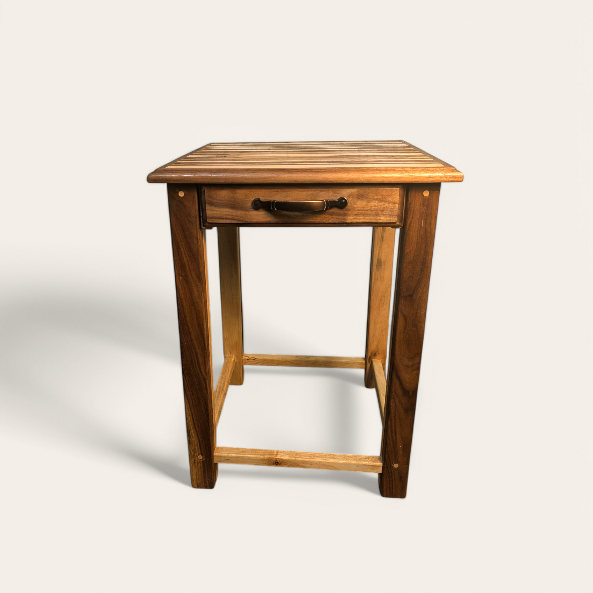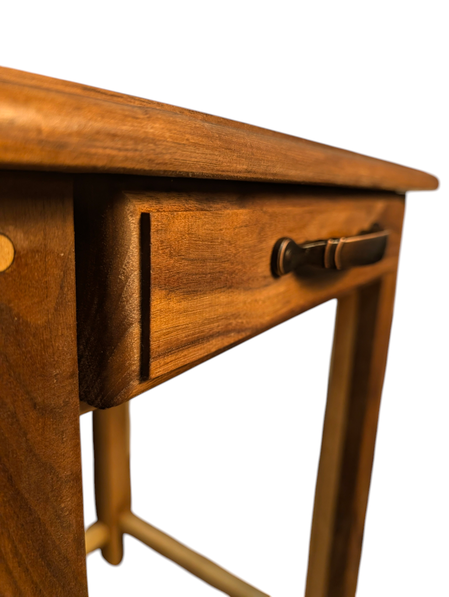 This handcrafted walnut and maple end table is a perfect blend of elegance and functionality. The tabletop is beautifully lined with rich walnut, showcasing its deep, warm tones and natural grain patterns, framed by the lighter, contrasting hues of solid maple. A spacious drawer, seamlessly integrated into the design, offers convenient storage for essentials, featuring smooth, durable joinery and a finely crafted handle. Supported by sturdy maple legs, this table provides a balanced and refined aesthetic, making it an ideal accent piece for any living space.