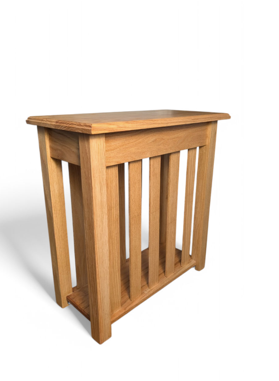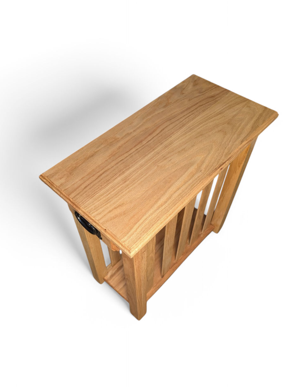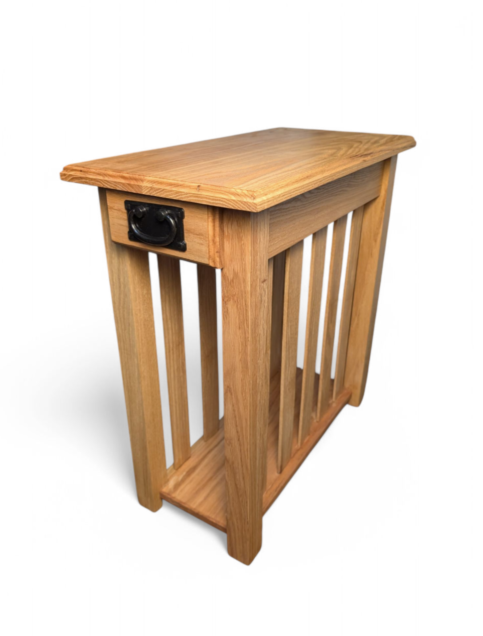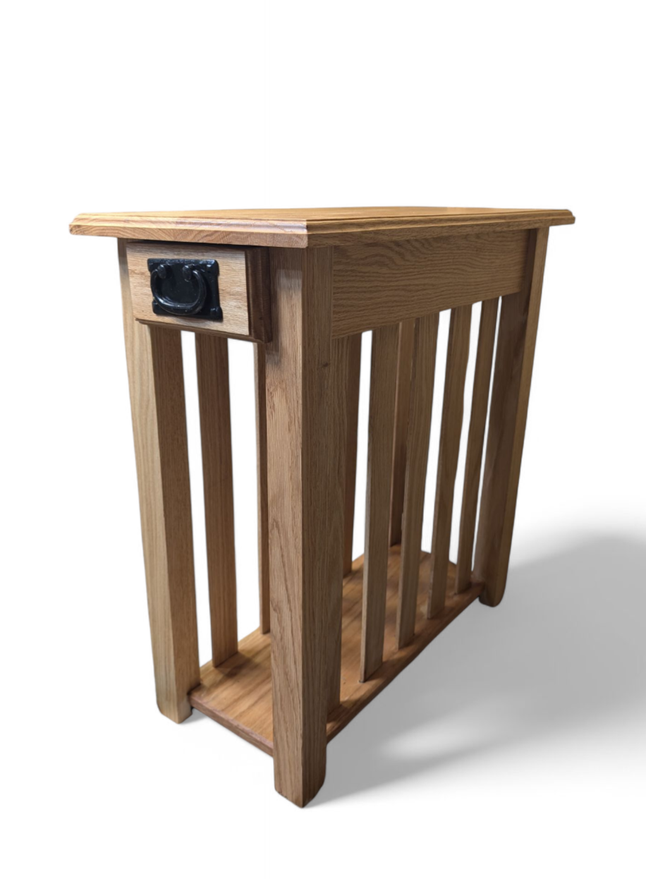 This Mission-style oak end table isn’t just furniture—it’s craftsmanship you can feel. Made from solid oak with classic slatted sides, a smooth-gliding drawer, and a sturdy lower shelf, it’s perfect for holding your coffee, remotes, or favorite reads. The black metal pull adds just the right touch of rustic charm.