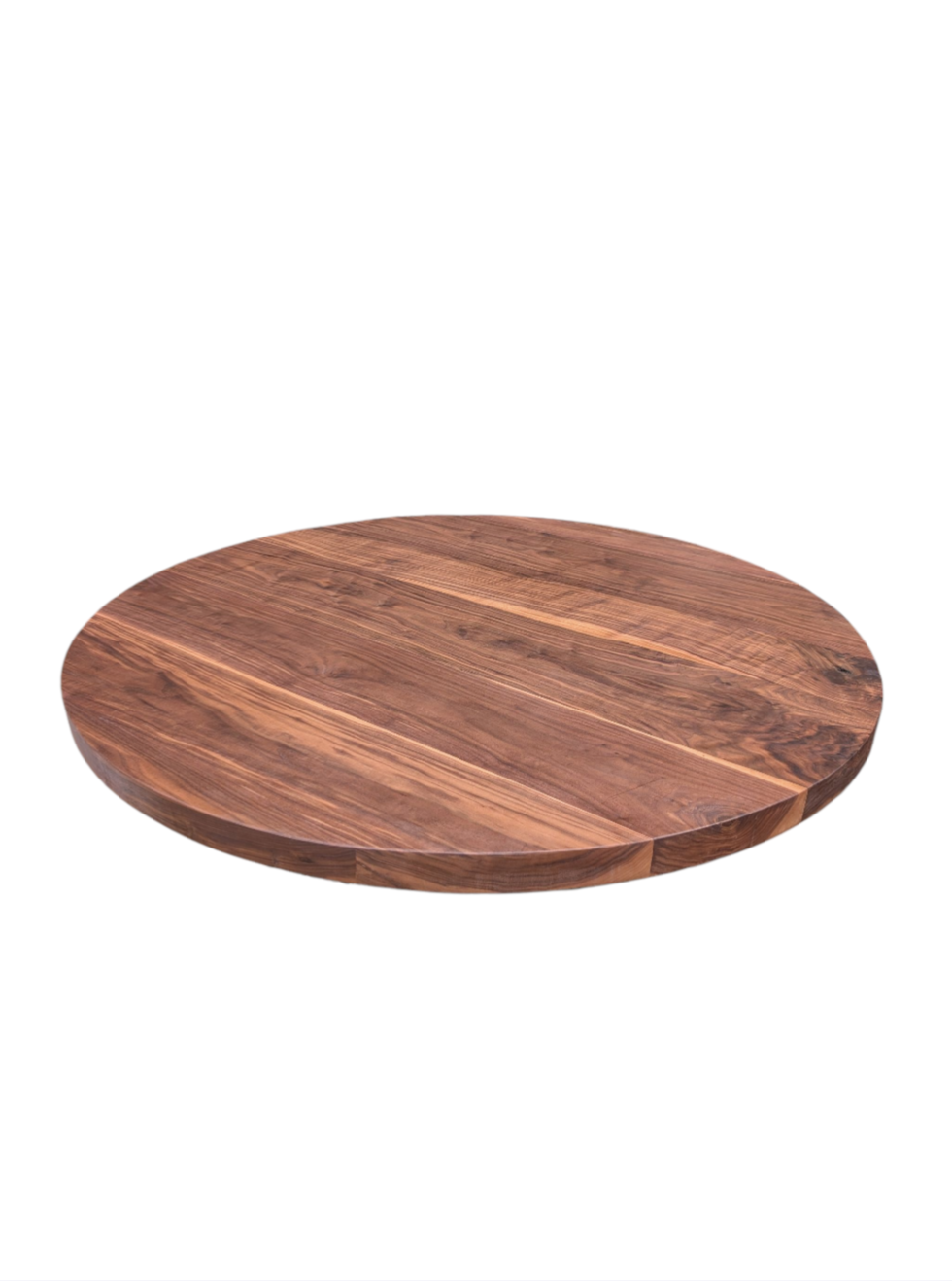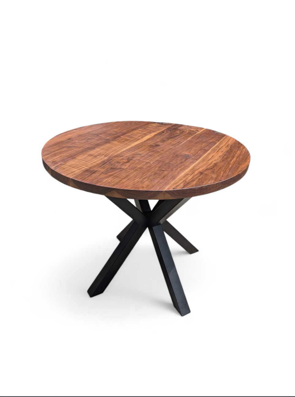 This handcrafted dining table features a stunning 48" x 48" round figured walnut top, built from 2" thick solid hardwood for a bold and luxurious presence. The walnut is carefully selected for its rich color and dramatic grain variation, showcasing deep browns and golden highlights that make every piece one-of-a-kind. At 36" tall, this table provides a perfect gathering height for dining, entertaining, or kitchen spaces.