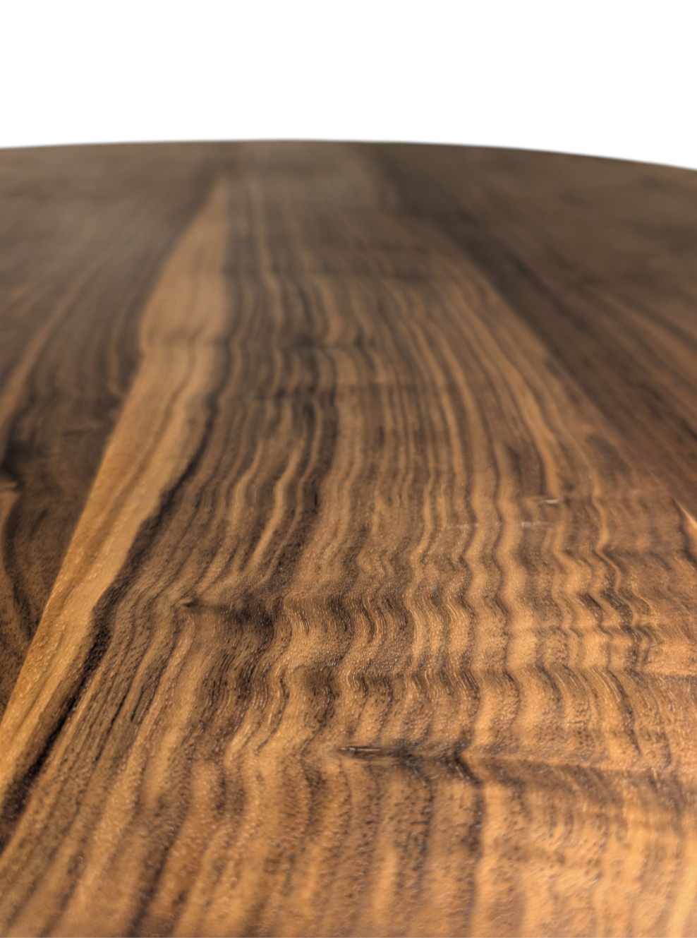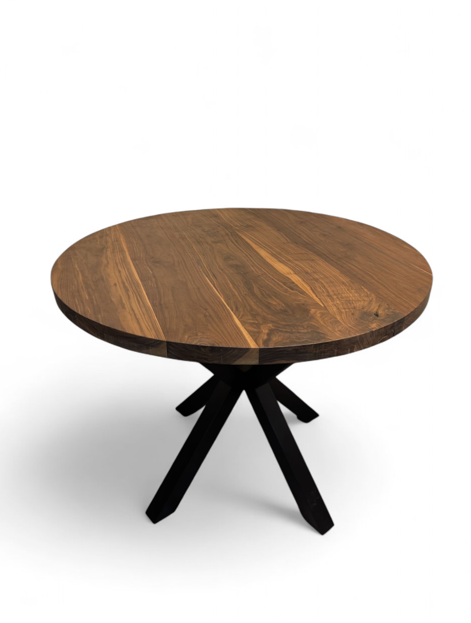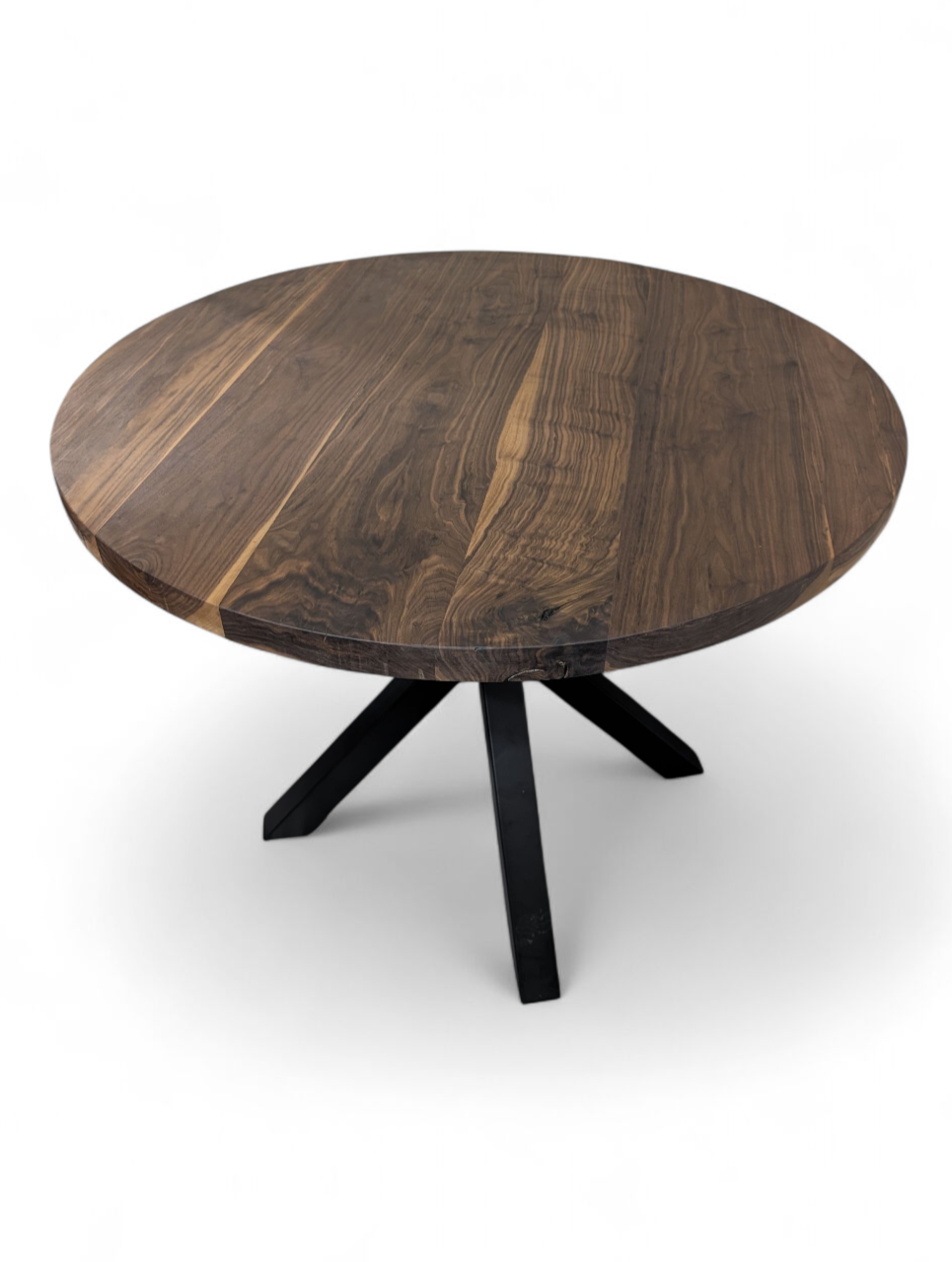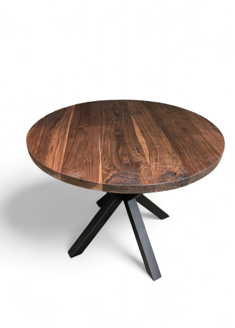 The tabletop rests on a modern black steel spider base, engineered for stability and strength while adding a sleek, contemporary contrast to the natural warmth of the wood. Finished with a premium protective oil to enhance the walnut’s depth and ensure lasting durability, this piece combines timeless craftsmanship with modern design.