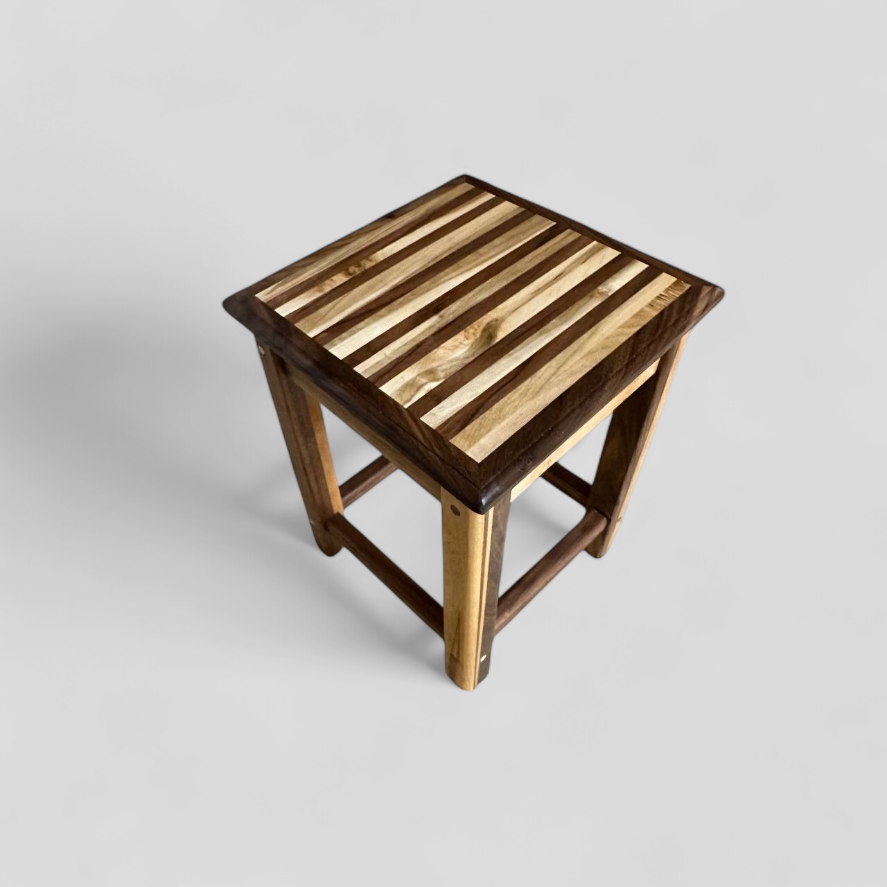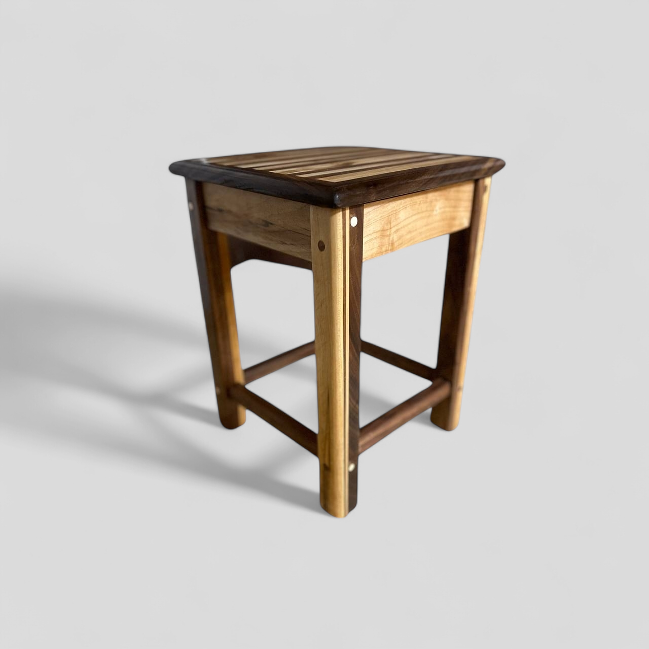 This custom walnut and maple end table is a perfect blend of craftsmanship and elegance, designed to elevate any space. The table features a rich walnut, and maple top, showcasing the natural beauty of its deep, warm grain, complemented by a walnut, and maple base with a smooth, creamy finish. The contrasting tones create a striking yet harmonious balance, making it a centerpiece in any room.