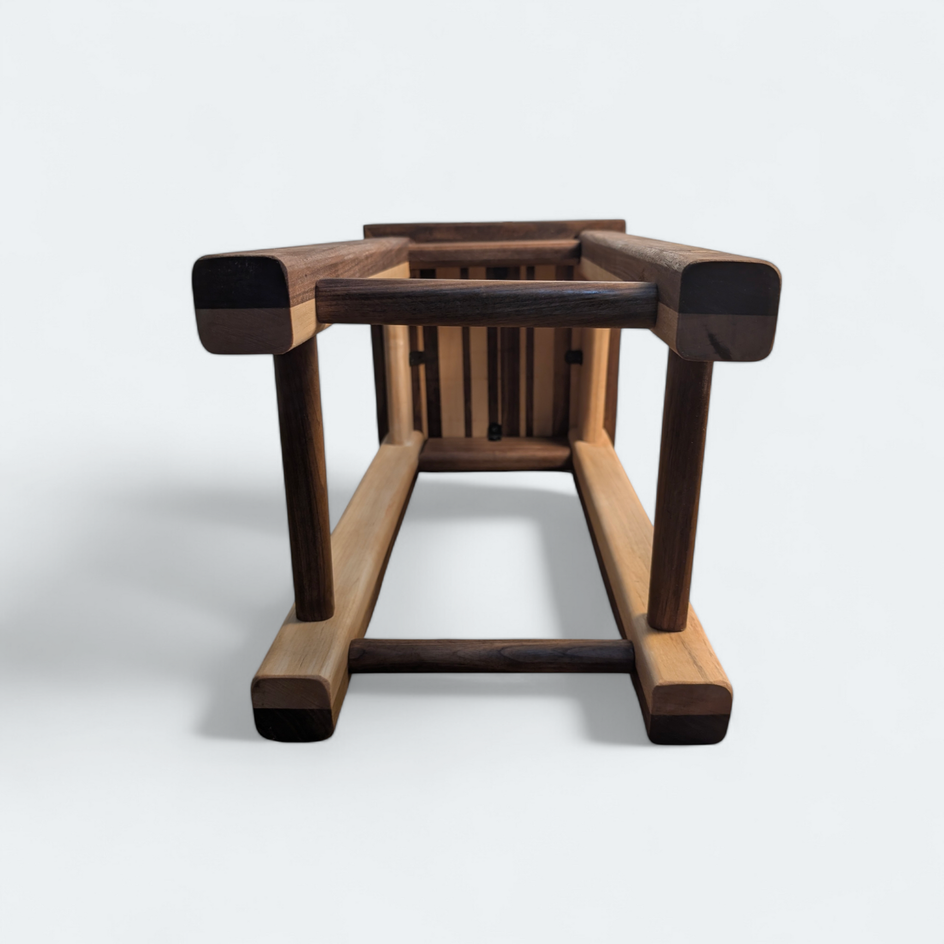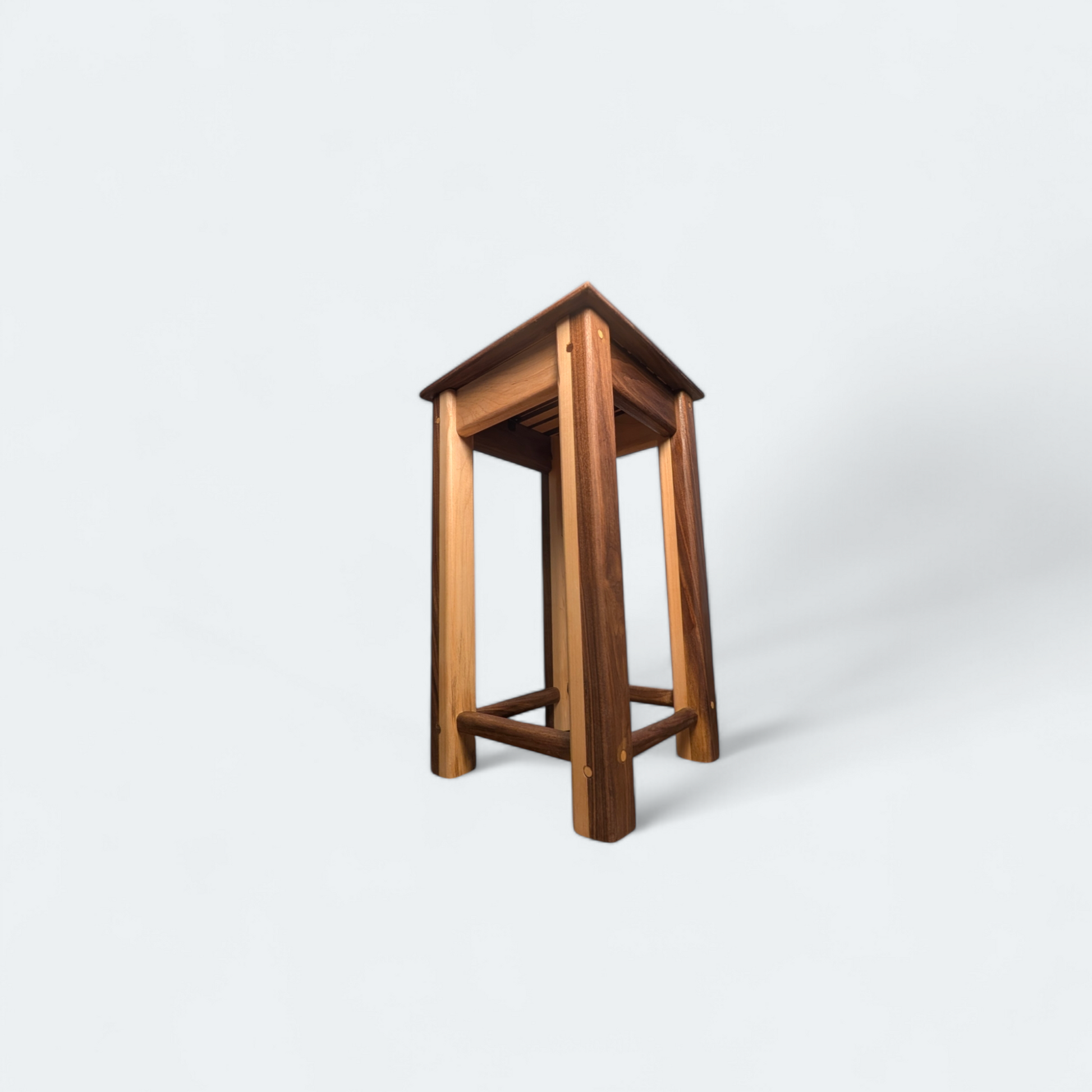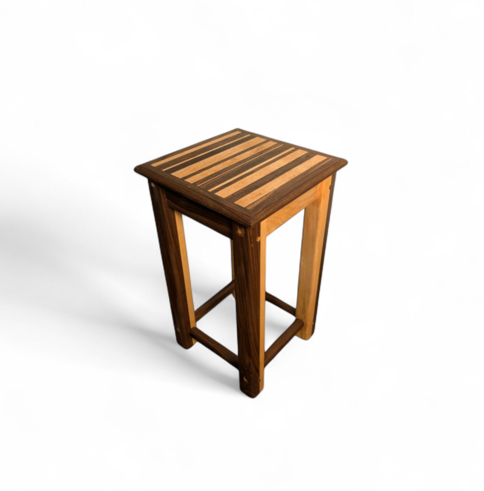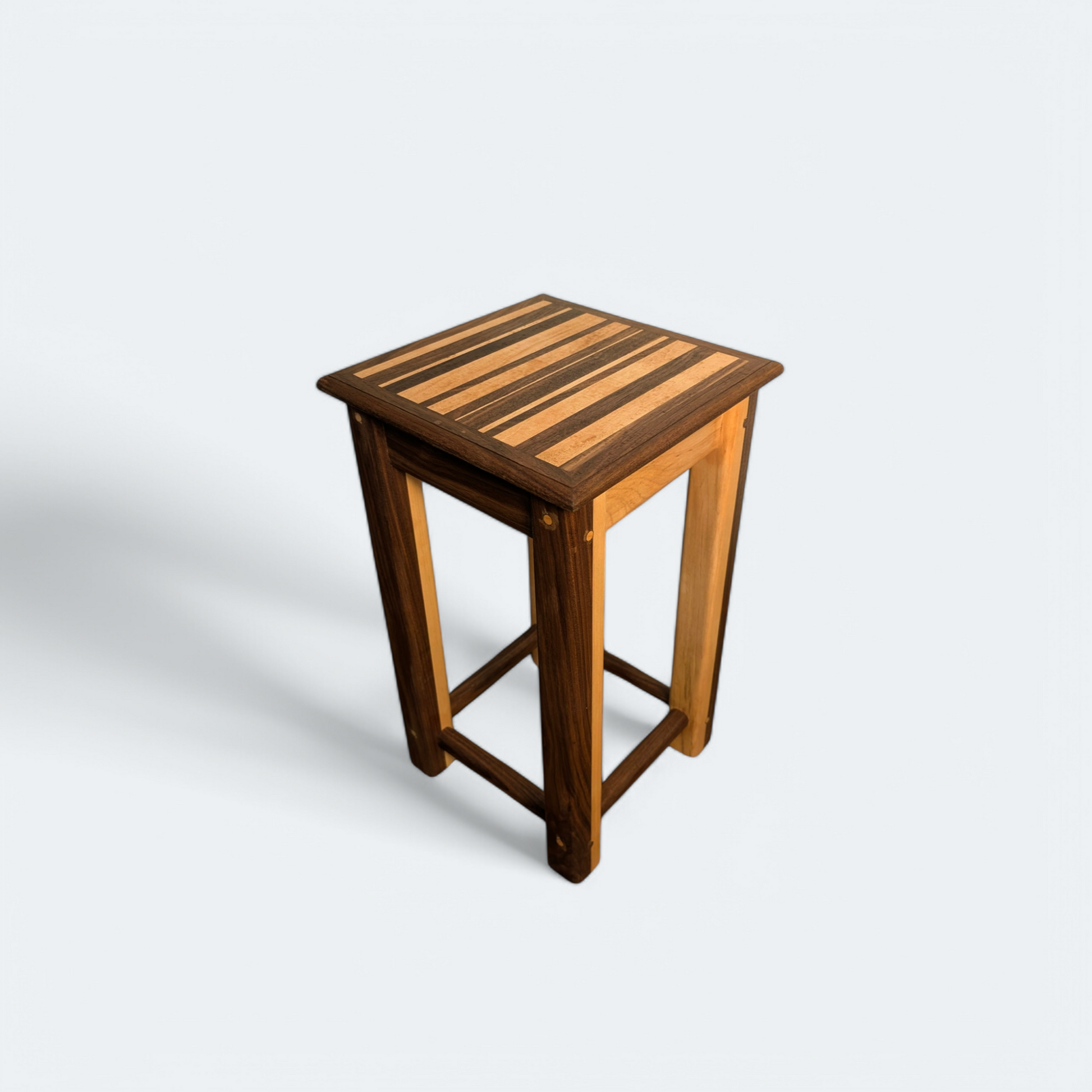 This is a custom-made wooden table crafted from walnut and maple. The square tabletop features an elegant striped pattern, showcasing the contrast between the rich, dark walnut and the light, creamy maple. The clean, geometric lines of the design emphasize its modern yet timeless appeal. The sturdy frame and legs, also constructed from walnut and maple, highlight the natural beauty and craftsmanship of the piece. Perfect as a side table or accent piece, this table combines durability with a refined aesthetic.