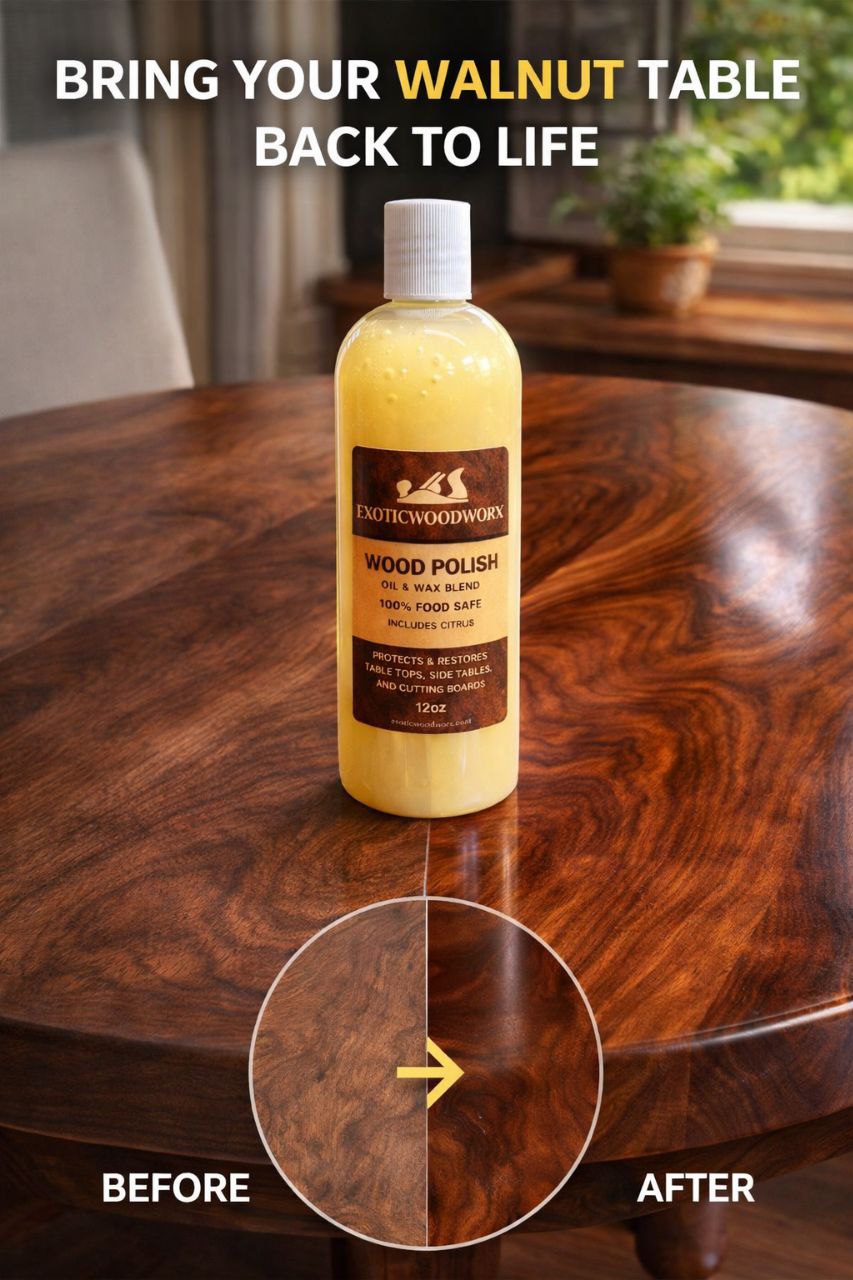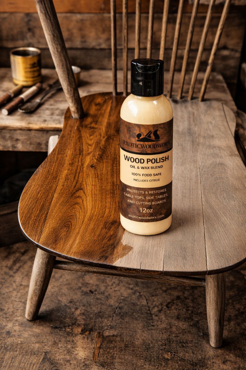 Exoticwoodworx Wood Polish is a rejuvenating blend of NSF certified Food Grade Mineral Oil, genuine beeswax, Brazilian carnauba wax (hardest natural wax available), and a touch of orange oil.